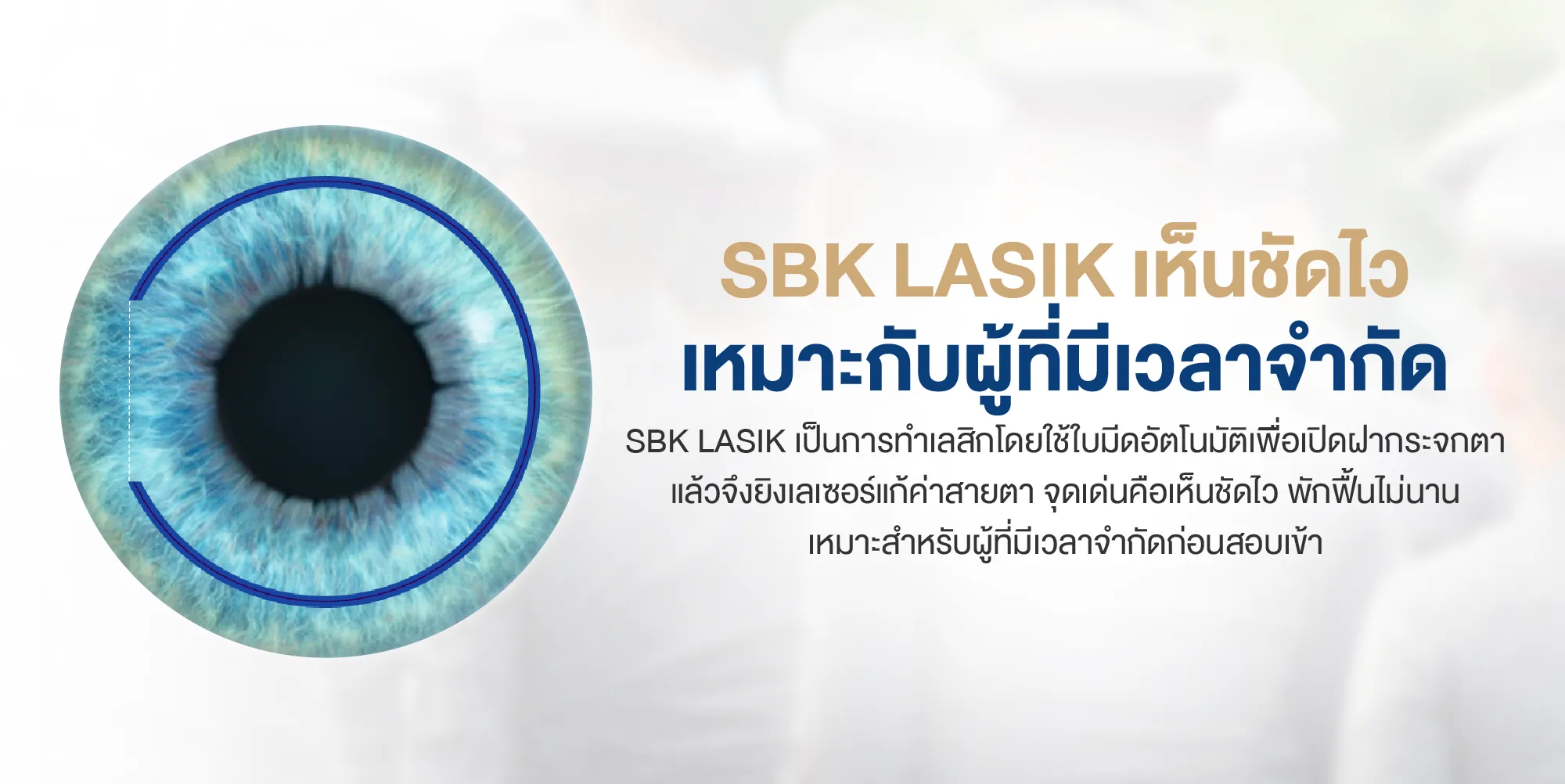 SBK LASIK เป็นการทำเลสิคโดยใช้ใบมีดอัตโนมัติเพื่อเปิดฝากระจกตาแล้วจึงยิงเลเซอร์แก้ค่าสายตา จุดเด่นคือเห็นชัดไว พักฟื้นไม่นาน เหมาะสำหรับผู้ที่มีเวลาจำกัดก่อนสอบเข้า เช่น มีเวลาเตรียมตัวไม่ถึง 1 เดือน